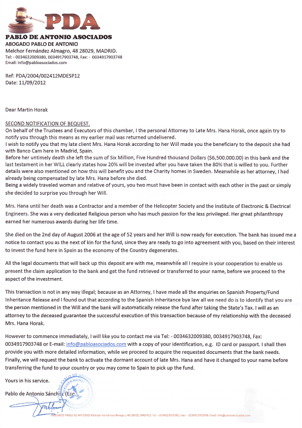 Innuti fanns ett fint brev från Pablo De Antonio Asociados. En ”jurist” firma i Madrid. De skriver att min släkting har dött 2006 och lämnar efter sig en mindre förmögenhet närmare bestämt 6 500 00 USD. De garanterar att detta är inte olagligt och jag ska BARA skicka in mina identitetshandlingar så att vi ska kunna gå vidare. Yeah right!